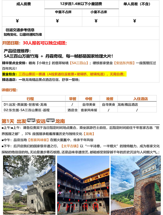 特价B【三百山-连住两晚龙南】3天2晚 特价【三百山两日游】2天1晚 特价A【三百山-连住两晚龙南】3天2晚 【大鹏团建1日】大鹏豪华双体帆船
